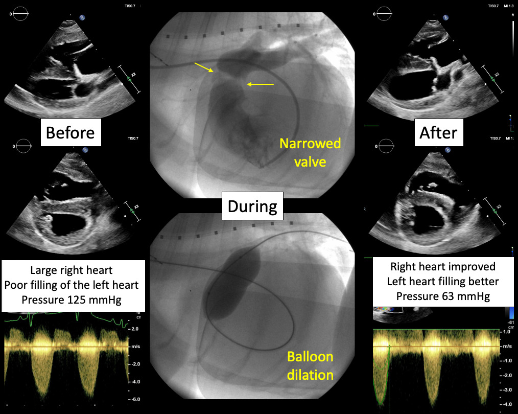 His heart scan showed an over-loaded right side of the heart, and an under-filled left heart. Severity of PS was graded as severe (125 mmHg, normally below 30 mmHg). Pulmonary valve stenosis can be successfully managed by performing a minimally invasive surgical procedure, called a balloon valvuloplasty. Here, fluoroscopic imaging is used to guide the placement of cardiac catheters and wires across the narrowed pulmonary valve, and a balloon dilation catheter is inflated to open the fused valve. After removal of the catheters and wires, only a small surgical wound remains. This requires very little post-operative pain relief, and minimal disruption to routine.