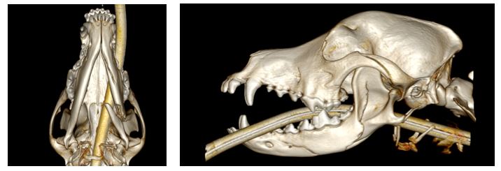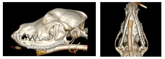 A CT allowed an exact appreciation of the dimensions of the fractures and their relationship to Lenny’s tooth roots, critical to preventing iatrogenic damage during repair of mandibular fractures. Lenny was noted to have 2 fractures, a rostral unfavourable fracture and a caudal, lingually displaced fragment. The displacement of the caudal fragment was resulting in subluxation of the left temporomandibular joint.