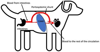 Animals with a portosystemic shunt have an extra abnormal blood vessel (shown as the large red curved arrow in the figure below) which allows blood to bypass the liver. There are different types of portosystemic shunt and the management and outcome for different types varies.