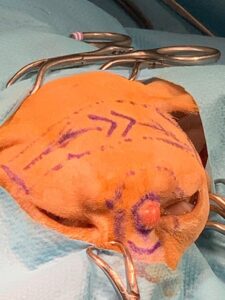 Although the mass was relatively small, it was very close to the medial canthus of Fleur’s left eye. The nature of the growth meant she was in danger of losing her eye completely, which both the surgeons and owners naturally wanted to avoid.