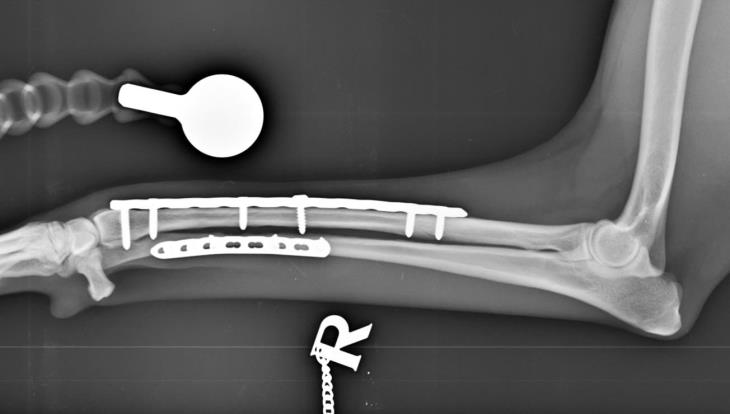 Often, only the radial fracture is stabilised, as this provides enough support for the ulna to heal by secondary bone healing. However, the blood supply to the distal radius and ulna is somewhat scarce due to the small amount of soft tissue surrounding the bone in Whippets and other small breeds. This can result in prolonged healing times. For this reason, plating of both bones was carried out. This gives maximum support and allows for the slow healing process to take place.